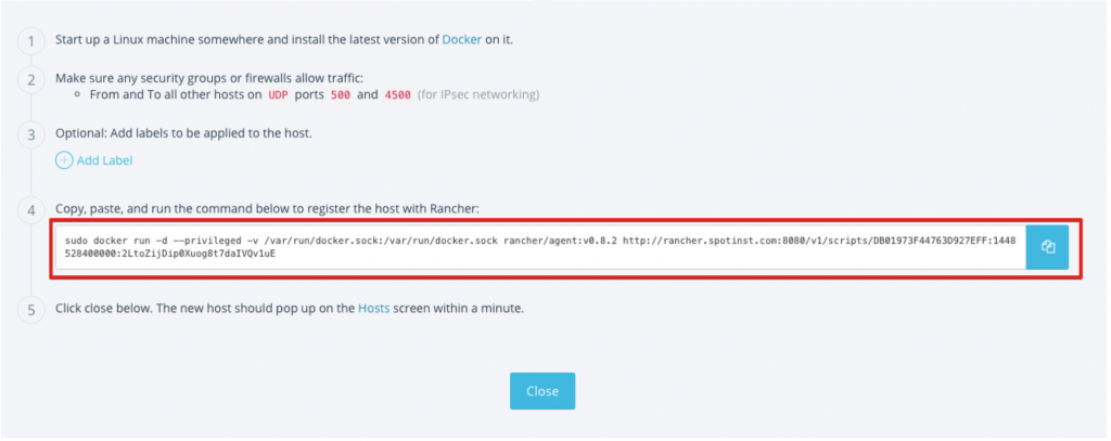 sudo docker run -d --privileged -v /var/run/docker.sock:/var/run/docker.sock rancher/agent:v0.8.2 http://rancher.spotinst.com/v1/scripts/1F68A2DE49C324F22ABE:1447257600000:v4W9vNzpG3GYr0mF6o4